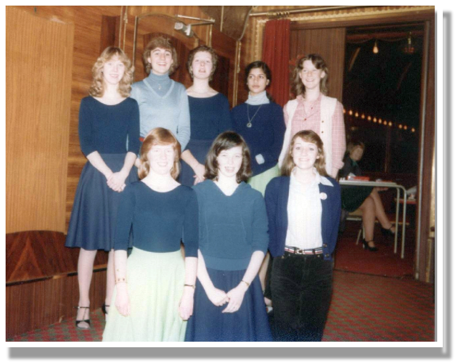 Front row Left to Right: Alison Harris, Lynne Shanks, Sharon Abraham, Louise Baxter, Linda Dadd, Lesley Lake, Diane Vaughan, Nilufer Patel, Wendy Thomas. ….. We think ! It was a long long time ago !