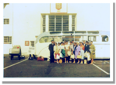 (Above) Penge Professional Team arriving at Jersey Airport in 1959 for cabaret performances at the West Park Pavilion, Jersey