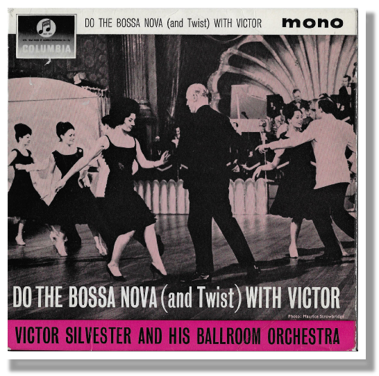(Left) Record sleeve featuring members of the Penge Four Couple Professional Team including John Ely, Jacqueline Wood and David Knight (far right) and Doreen Freeman and Victor Silvester in front.