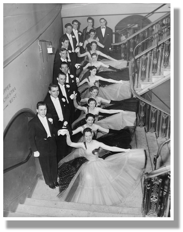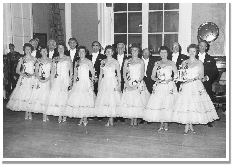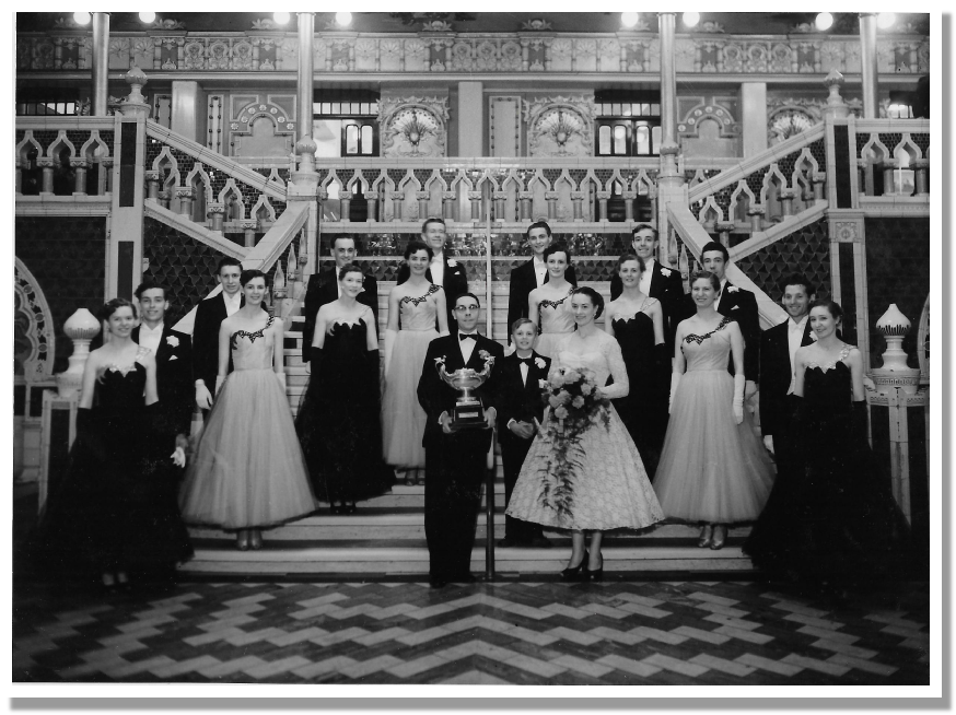 In 1955 we danced in the Blackpool Formation Championship at Blackpool Winter Gardens and won. A photograph of the team was taken with Frank and Peggy holding the prestigious cup. Members of that first team that won at Blackpool were (including reserves) Brian Hitchen (Captain), Gladys Firmin, Alfred Clark, Jean Hall, Robert O'Hara, Sheila Hewitt, David Knight, Vera Petty, Bert Booth, Joan Wood, Valerie and Sheila Trowse, Bernard O'Connor, Victor Norman, Peter and Nora North, Dennis and Margaret Read, David and Wynn Duffy, Ron and Maureen Fox and Helena Spencer. Fourteen formation teams had entered from all over the U.K and one from Holland.