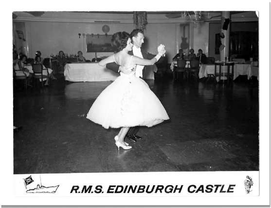 After 9 years of teaching at the Peggy Spencer Dancing school he and his future wife Joyce were invited to both teach and perform, on the cruise ships of the Union Castle Line. They mainly worked on the RMS Edinburgh Castle travelling between UK and South Africa. Joyce often spoke about the lovely people she had met on her travels to South Africa commenting on the kindness she and Alf had been shown by the locals.